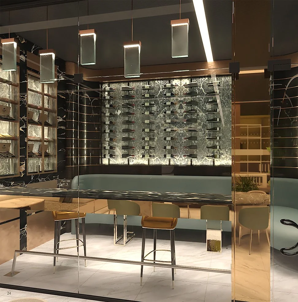 Stepping into the cigar room is an invitation to indulge in a world of refined luxury and timeless elegance. The meticulously chosen high-end finishes will captivate ones senses. The space is filled with varying marble floor and wall finishes, complimented and balanced by the copper and brass trims, creating a warm and rich space. The plush furniture selected help create an overall comforting and relaxing time in the cigar room.