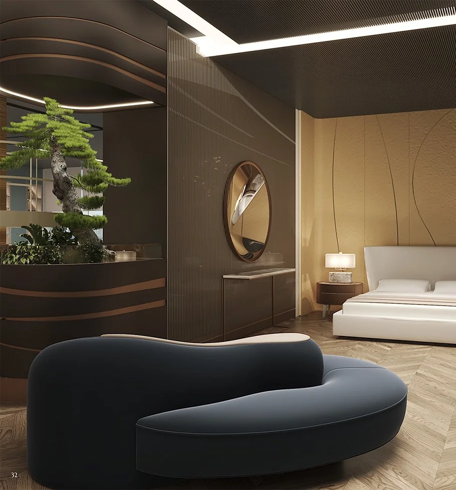 The master bedroom is a space for rest and tranquil. Thus, in this space we focused on smooth, minimal and curved lines. We have applied this in both our finishes, as well as our carefully selected furniture that invites the guests to sink into its seats.